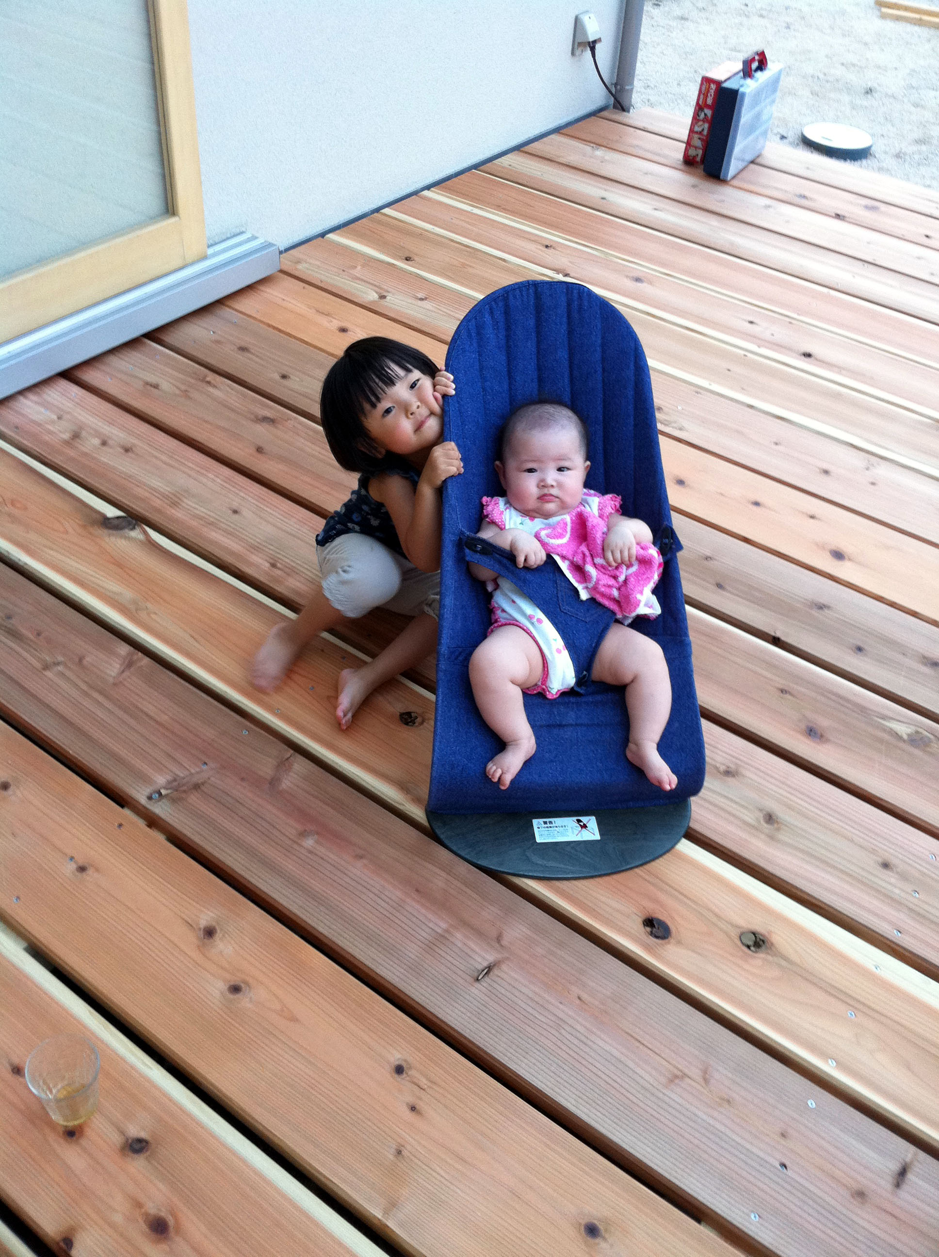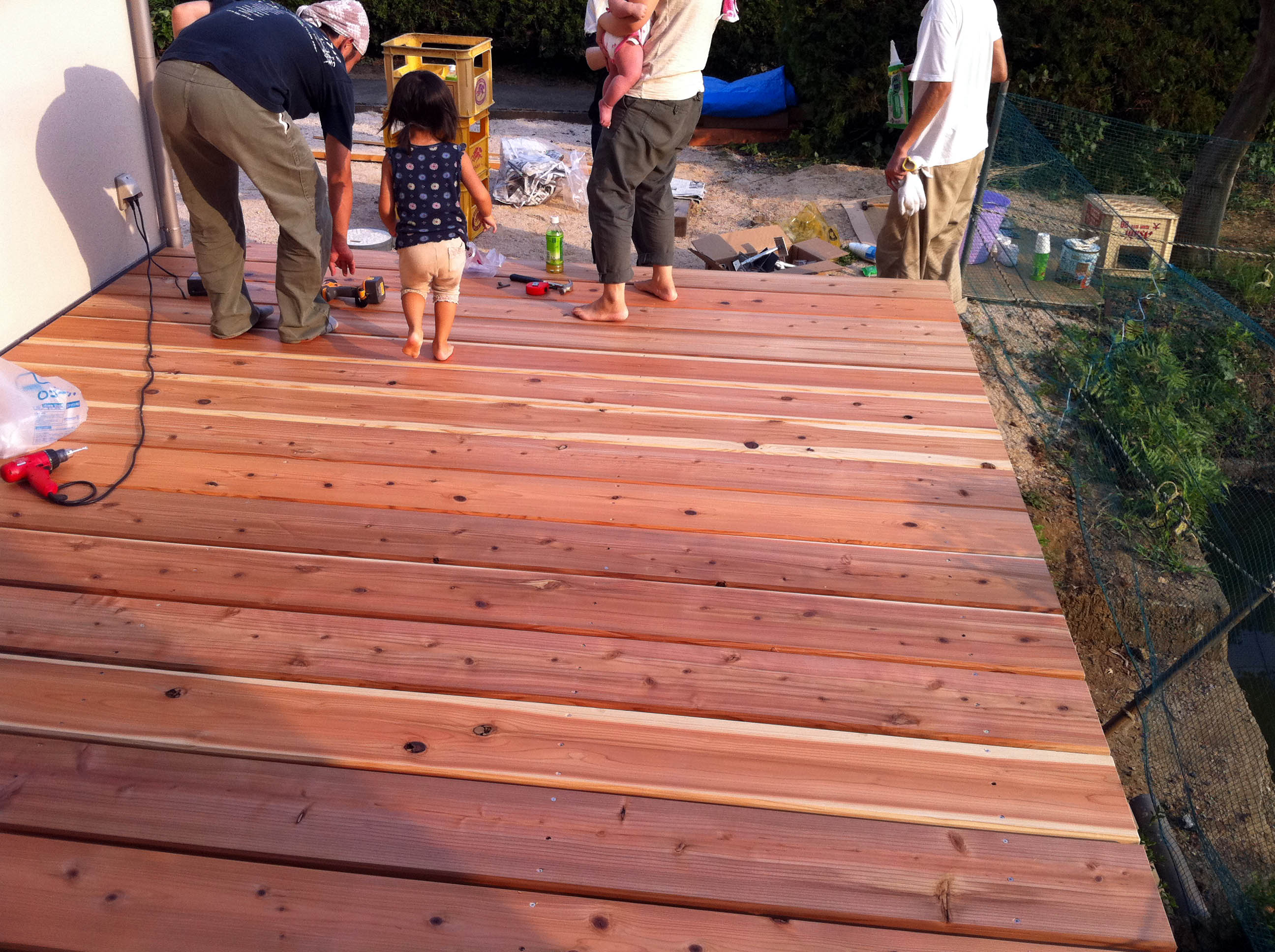 昨日、スタッフ一同で晴天の中、綾部ランチハウスの庭にデッキ作りを手伝いに行きました。みんな大汗かきながら何とか当日中に完成です。お母さんから差し入れいただいたおいなりさんを頬張りながらデッキで夕涼みしていると安国寺の鐘の音が「ごぉーん」と聞こえてきてなんとも哀愁が漂ってきました。。 全員参加です。 最後のビスはご主人さんが止めつけ。 何とか完成しました。 ちょっと疲れたかなー、、姉妹の記念撮影で締めくくりました。