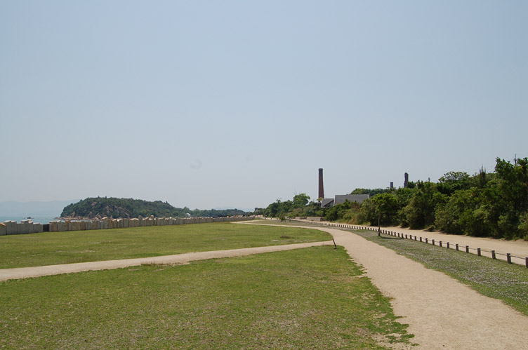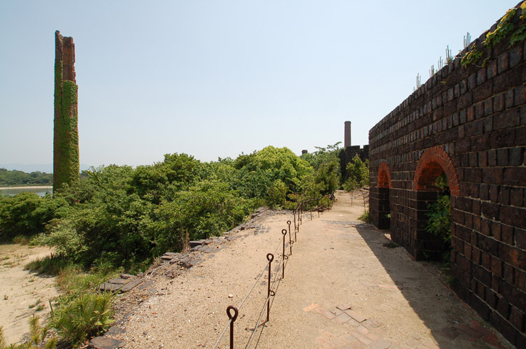 精錬所へのアプローチ。こわれかけた煉瓦の煙突が忘れ得ぬ過去のさまざまな情景を伝えると同時に期待感が高まります。
