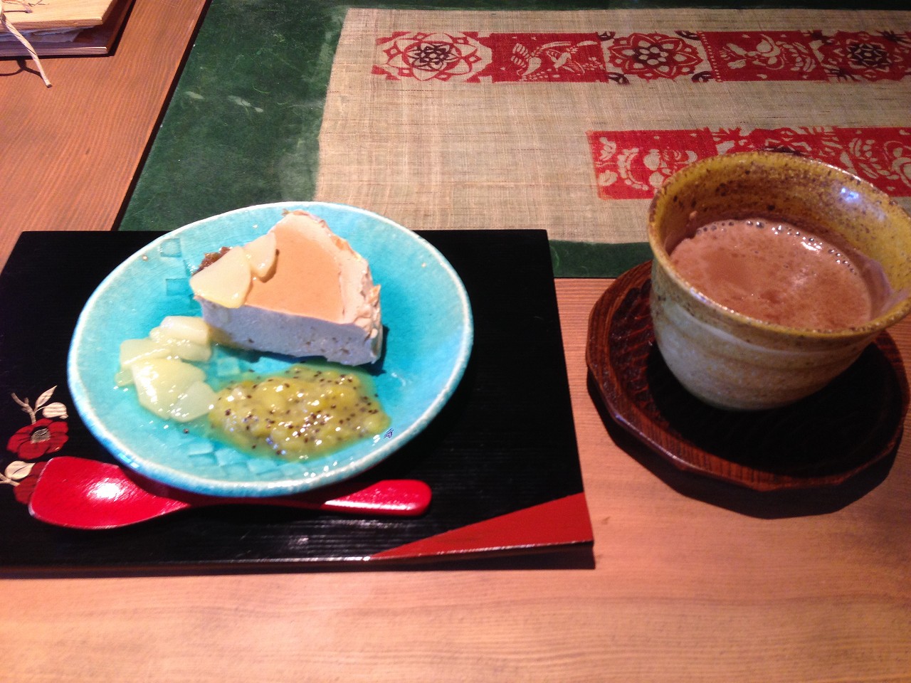 ランチの後に頼んだ豆腐のケーキとホットチョコレートです。あっさりとした豆腐の口当たりにこれでもかと言う濃厚なチョコレートが幸せです。